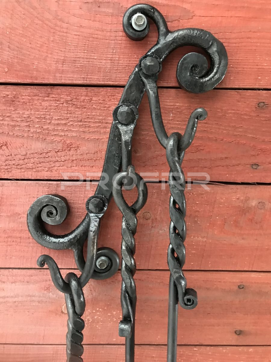 На изображении представлен фрагмент кованого каминного набора, закреплённого на деревянной стене. Композиция выполнена из чёрного металла с характерным художественным изгибом и завитками, что придаёт изделию декоративность и изысканность.
