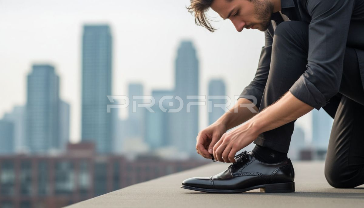 Композиция фотографии акцентирует внимание на деталях: тщательности, с которой мужчина завязывает шнурки, и элегантности его обуви и одежды. Снимок может ассоциироваться с подготовкой к важному событию или деловой встрече в большом городе.