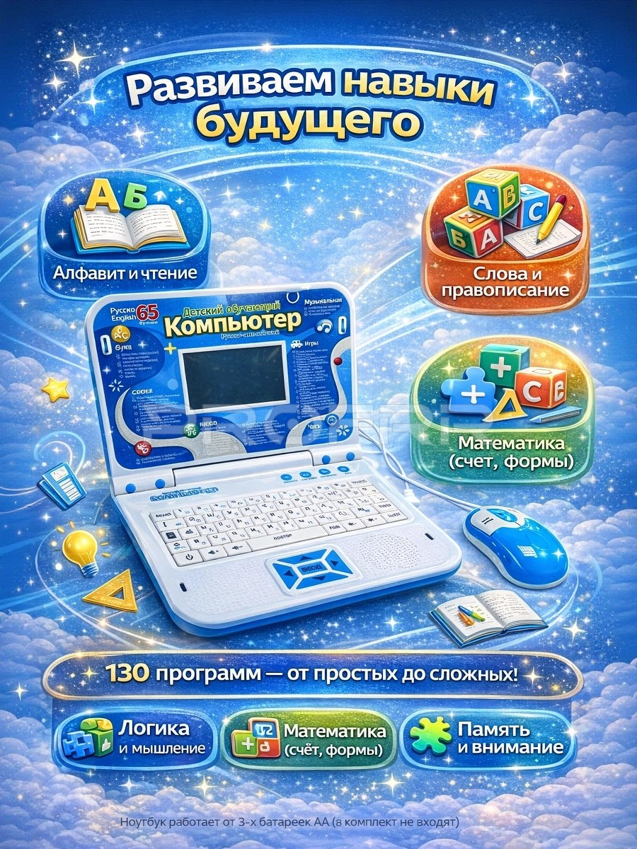 - Дополнительная информация: «Ноутбук работает от 3-х батареек АА (в комплект не входят)» — размещена внизу.