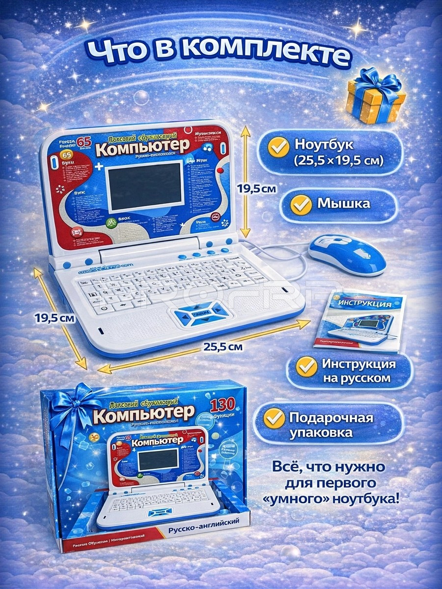 - Заголовок в верхней части: «Умный детский ноутбук: учимся играя!» — выполнен крупным шрифтом с жёлтыми и белыми буквами.