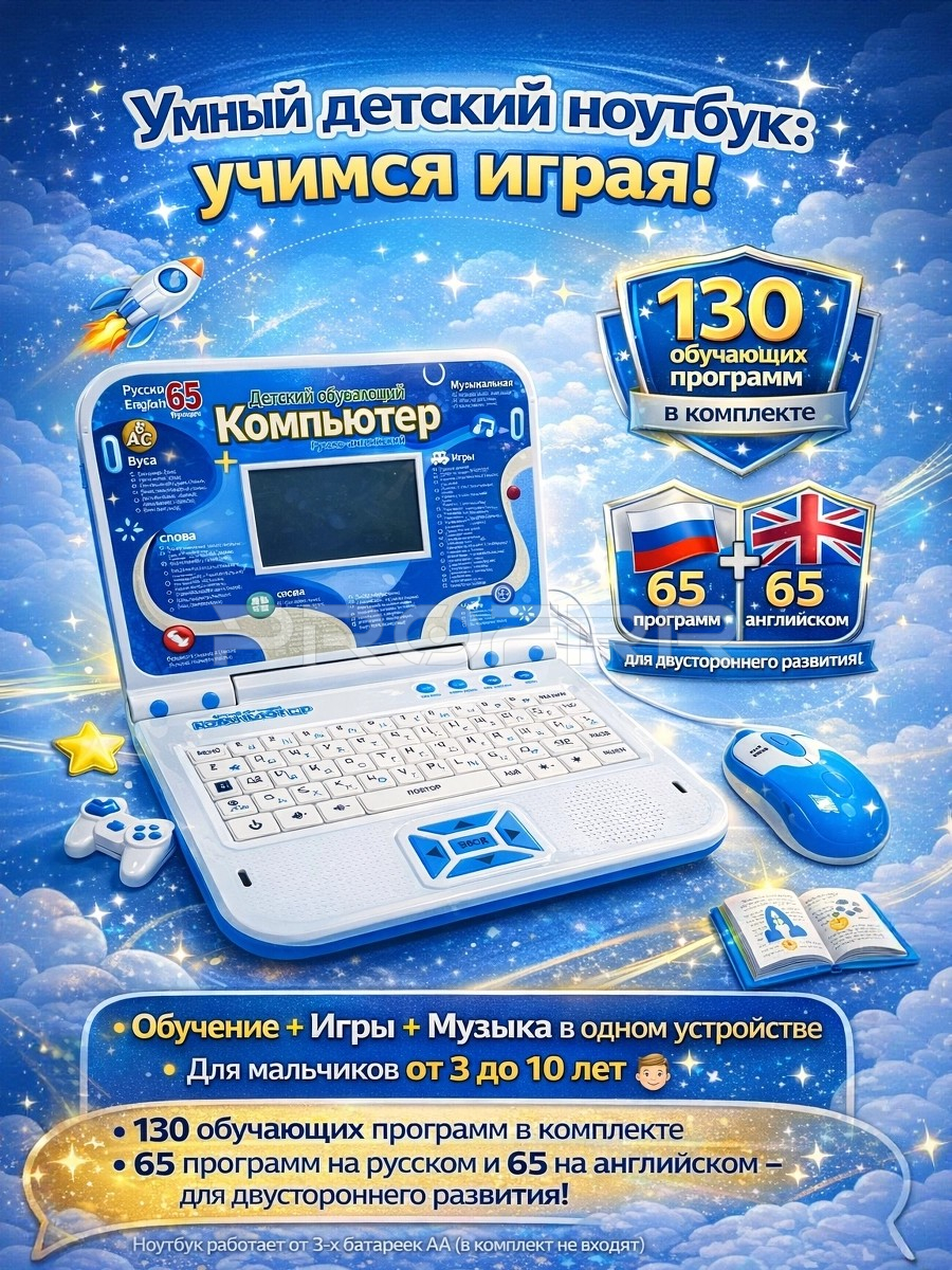На изображениях представлен рекламный постер детского обучающего ноутбука под названием «Умный детский ноутбук: учимся играя!».