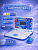 Центральный элемент — изображение самого ноутбука светло-голубого цвета с клавиатурой, экраном и дополнительными кнопками управления. Рядом с ноутбуком расположены аксессуары: