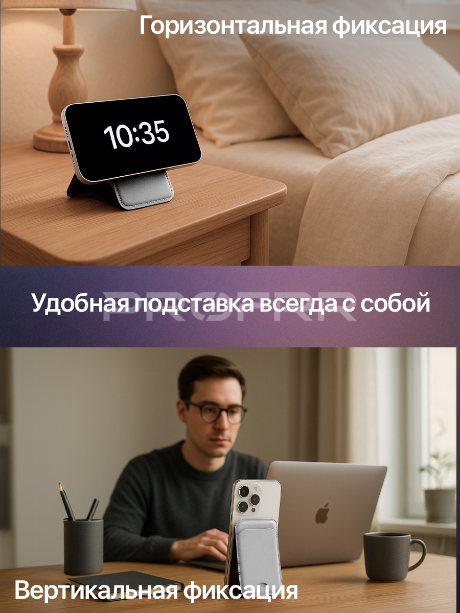 Общее впечатление: Реклама подчёркивает практичность, безопасность и совместимость картхолдера-подставки. Продукт ориентирован на владельцев iPhone, ценящих удобство хранения карт и защиту личных данных. Дизайн изображения современный, технологичный и информативный — все ключевые преимущества сразу видны пользователю.