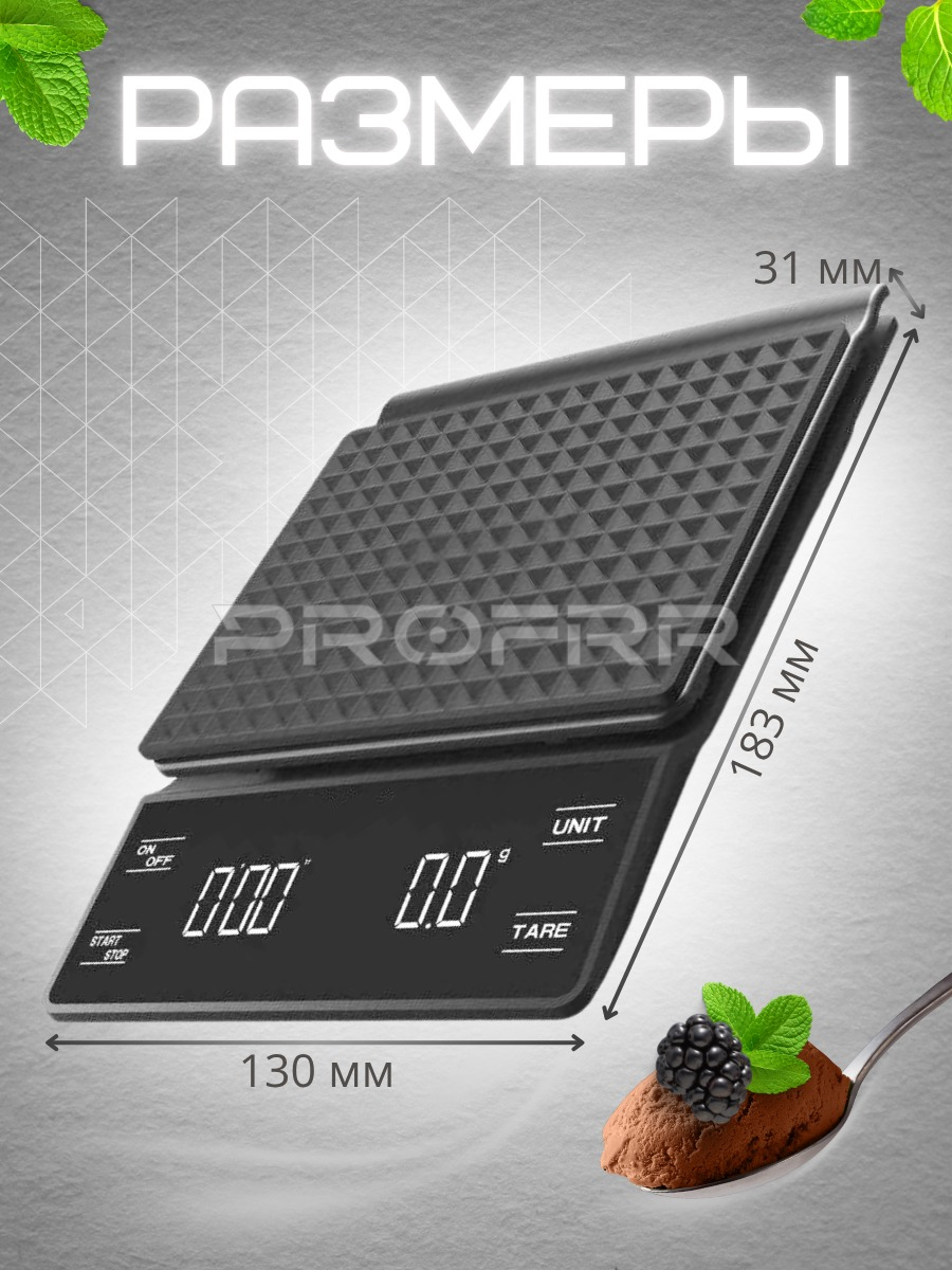 - Кнопки управления: видны на корпусе, включая кнопки «ON/OFF», «START/STOP» (для таймера) и «TARE» (функция тарирования — вычитания веса тары).