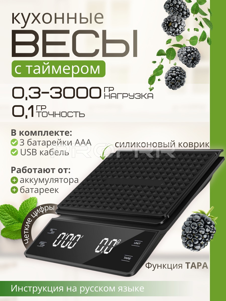 Верхняя часть содержит крупный заголовок: «кухонные ВЕСЫ с таймером», где слово «ВЕСЫ» выделено особенно крупно и тёмно. Рядом с заголовком изображены ягоды ежевики и листья мяты, создающие ассоциацию с кулинарией и свежестью.