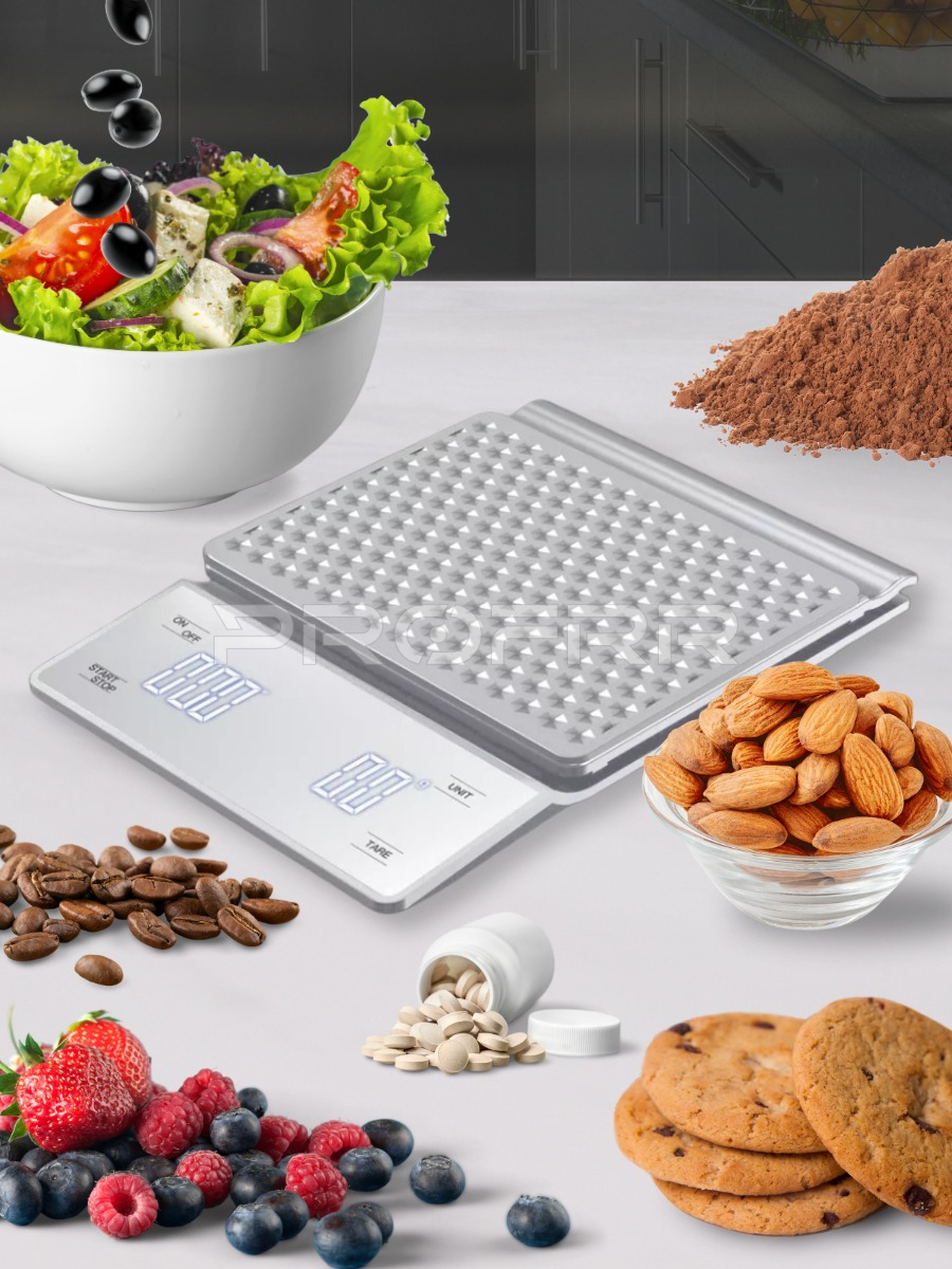 На изображении представлена реклама кухонных весов с таймером. Дизайн выполнен в светлых и зелёных тонах, создающих ощущение свежести и практичности.