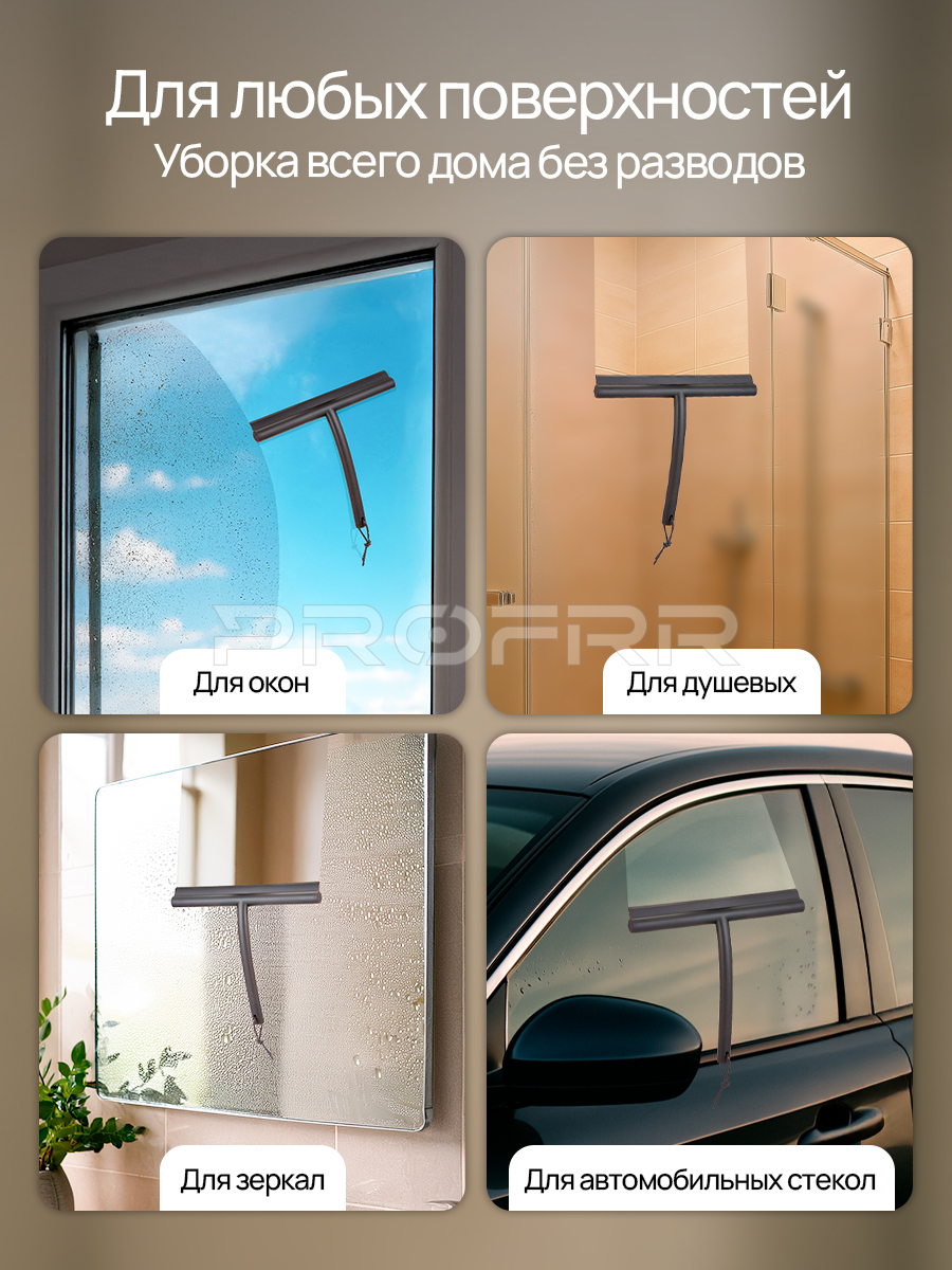 На изображении представлена реклама водосгона-скребка — инструмента для удаления воды с гладких поверхностей (например, стёкол, кафеля, дверей душевых кабин).