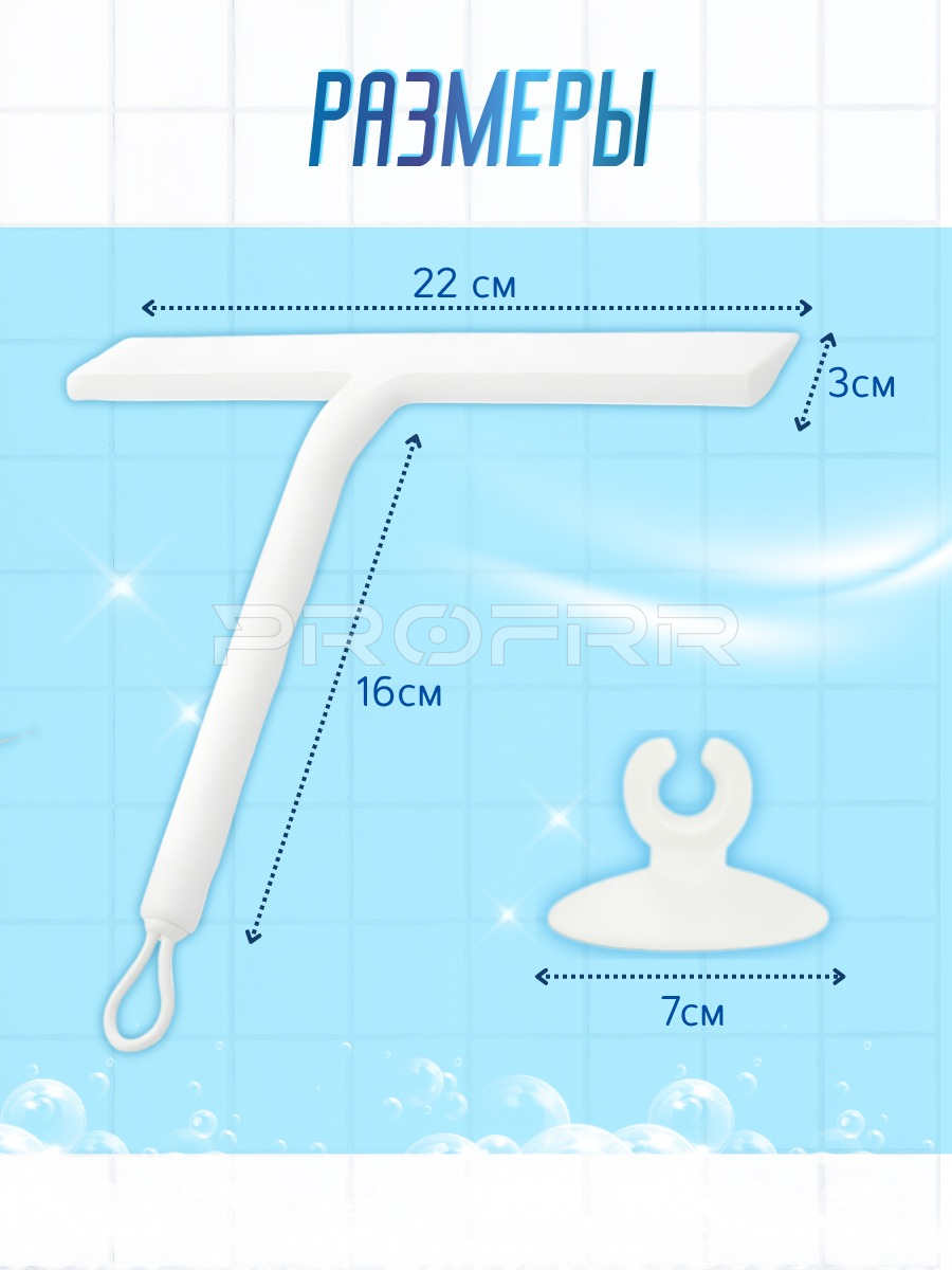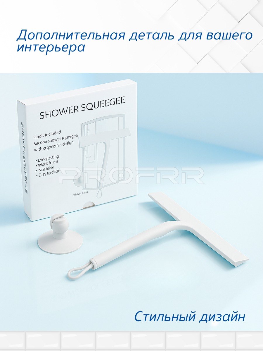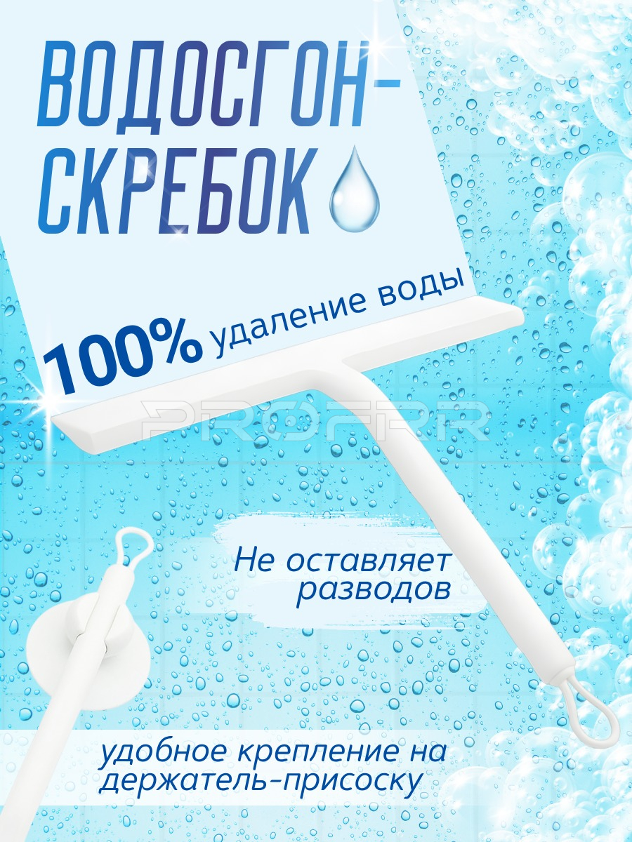 Общее впечатление: Реклама выполнена в ярком и привлекательном стиле. Акцент сделан на ключевых преимуществах товара: эффективности (100% удаление воды), качестве очистки (без разводов) и удобстве хранения (крепление на присоску). Цветовая гамма (голубой, белый, синий) подчёркивает чистоту и надёжность изделия. Изображение чётко демонстрирует как внешний вид товара, так и его функциональные особенности.
