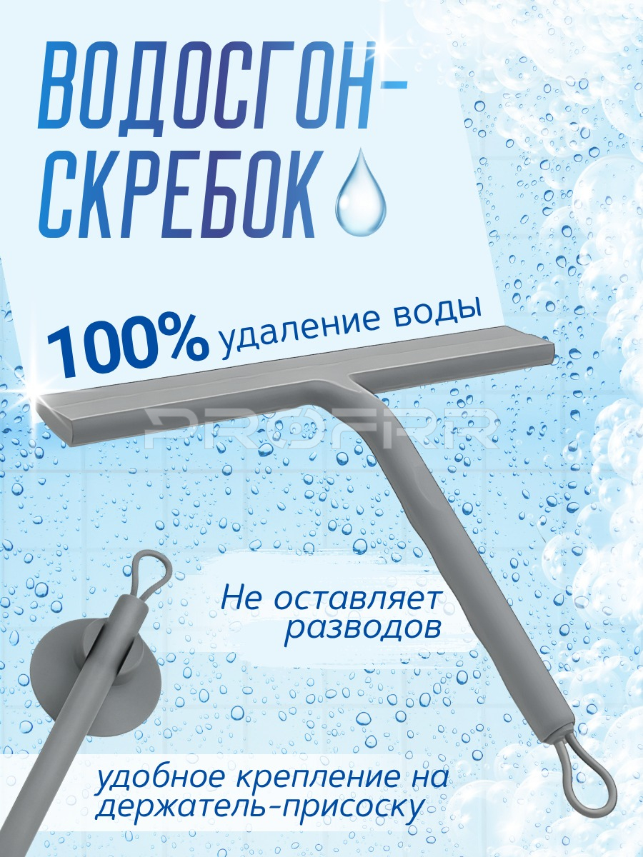 - Крепление: показан держатель-присоска, который позволяет надёжно фиксировать водосгон на гладкой поверхности (например, на стекле или кафеле).