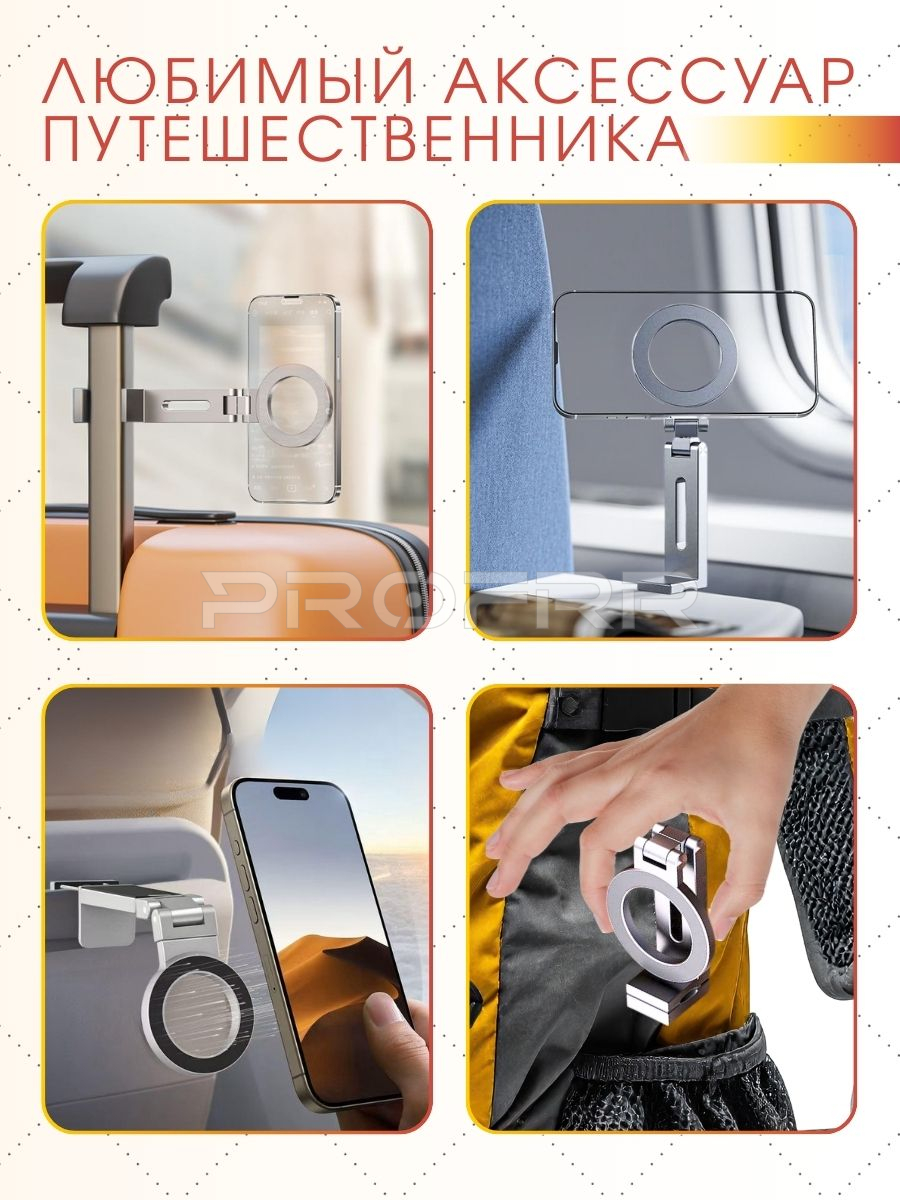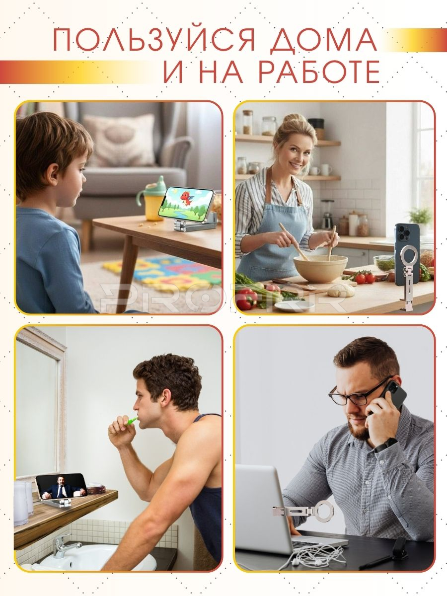 Общее впечатление: Реклама подчёркивает универсальность, надёжность и удобство магнитного держателя. Дизайн лаконичен, но информативен — сразу видны все ключевые характеристики и преимущества товара. Продукт подойдёт для домашнего использования, офиса или путешествий, где важна мобильность и удобство размещения смартфона.