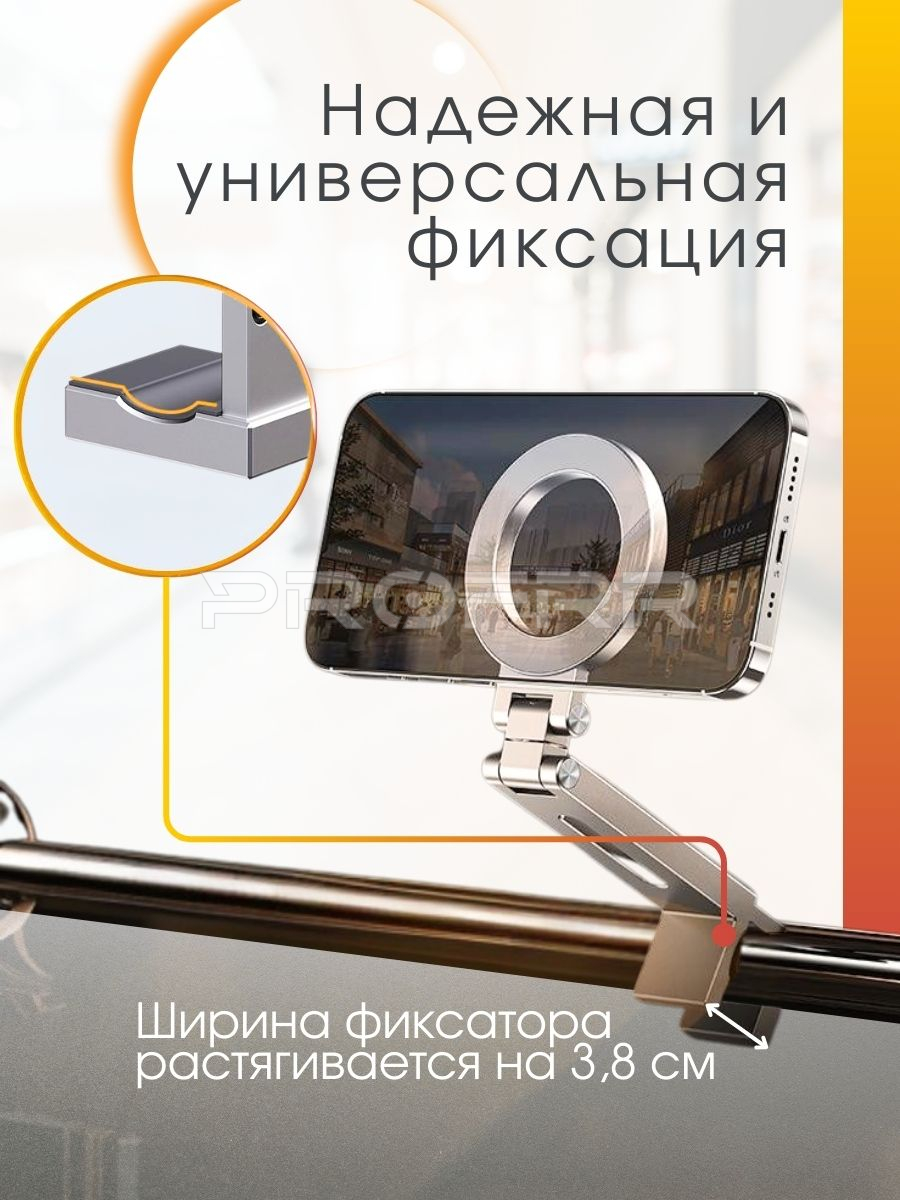 Зажимный держатель для смартфона с магнитным креплением MagSafe. Цвет серебро. Материал: алюминиевый сплав, силикон, магнит. Артикул 704996176